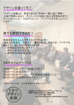 まちなかで何かをやってみたい人も、まだ何をしたいか分からない人も、ふらっと立ち寄れる対話の場「くさつデザイン会議」を開催します。