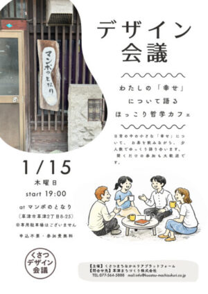 草津のまちの未来を描いた「未来ビジョン」の実現に向けて、各々の得意を持ち寄り、挑戦したい人や応援したい人が集まる共創の場として「まちなかでやってみたいこと」を話し合うデザイン会議。業種や立場を問わず誰でも気軽に参加でき、聞くだけの参加もOK。緩やかにつながれる場を毎月第3木曜日に、まちなかのどこかで開催しています。
